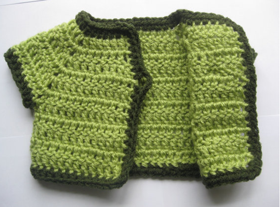 sonra yedi sıra dolguyu ördükten sonra çekilen 2 zincir boşluğunun trabzanın içine bir sıra dolgu yine iki zincir çekin ve trabzanın içine 1 dolgu daha yaparak ondört sıra olan karşı tarafa geçin. ve aynı şekilde iki zincir boşluğunun içine dolgu yaparak örmeye devam edin. Arkalı önlü olarak örülenyeşil bebek yeleğinin yapımı koltuk altına kadar dolgu sayıları artmışolacak. koltuk altına geldiğiniz noktada yeleğe koltuk altı kesimi yapın. sizlerördükçe bebek yeleğinin kolkısmı oluşacaktır.